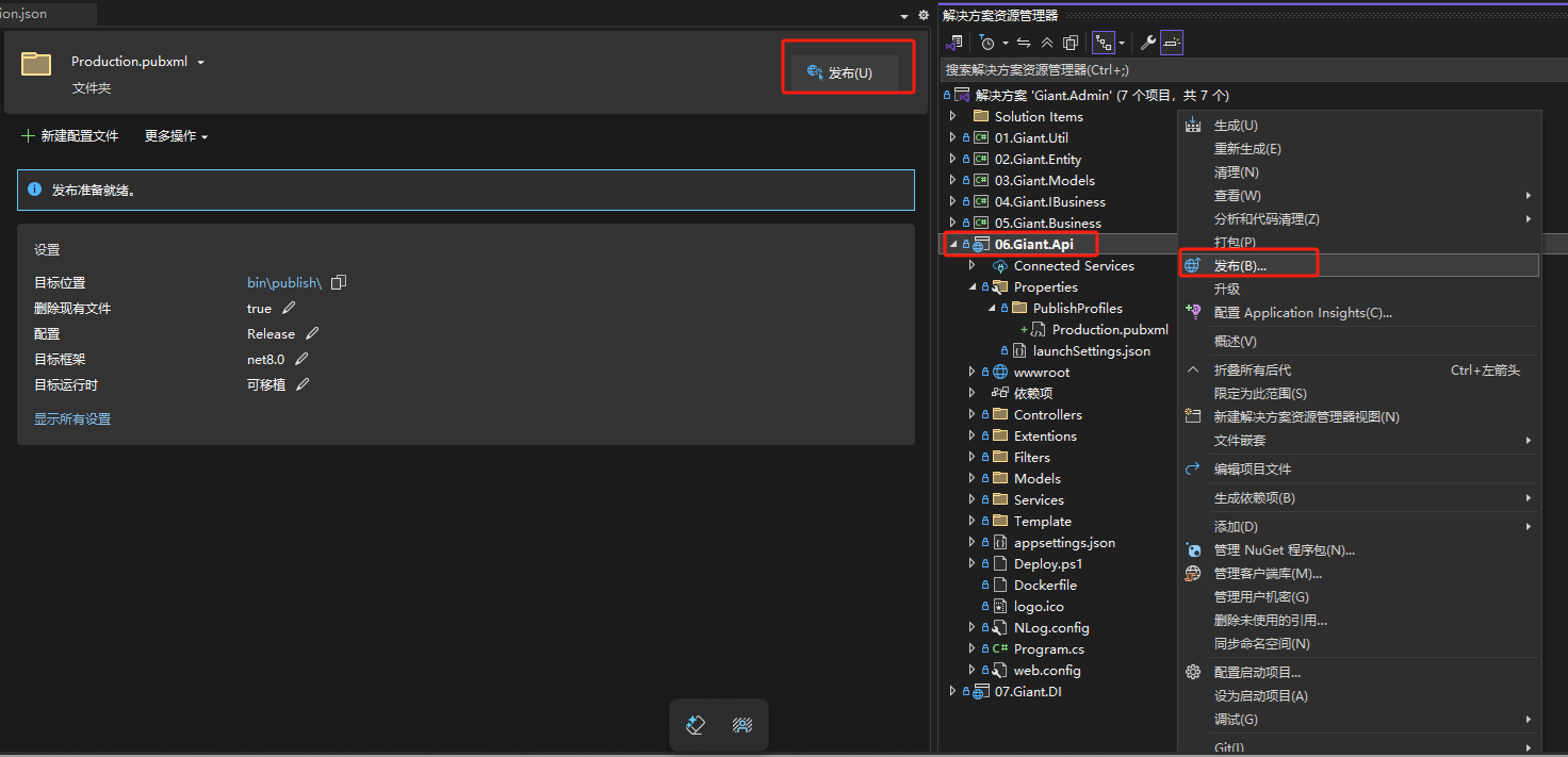 1. 在Giant.Api项目上点右键,选择“发布”