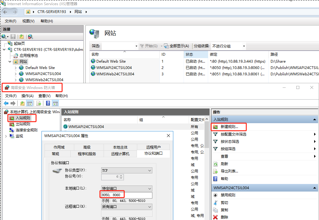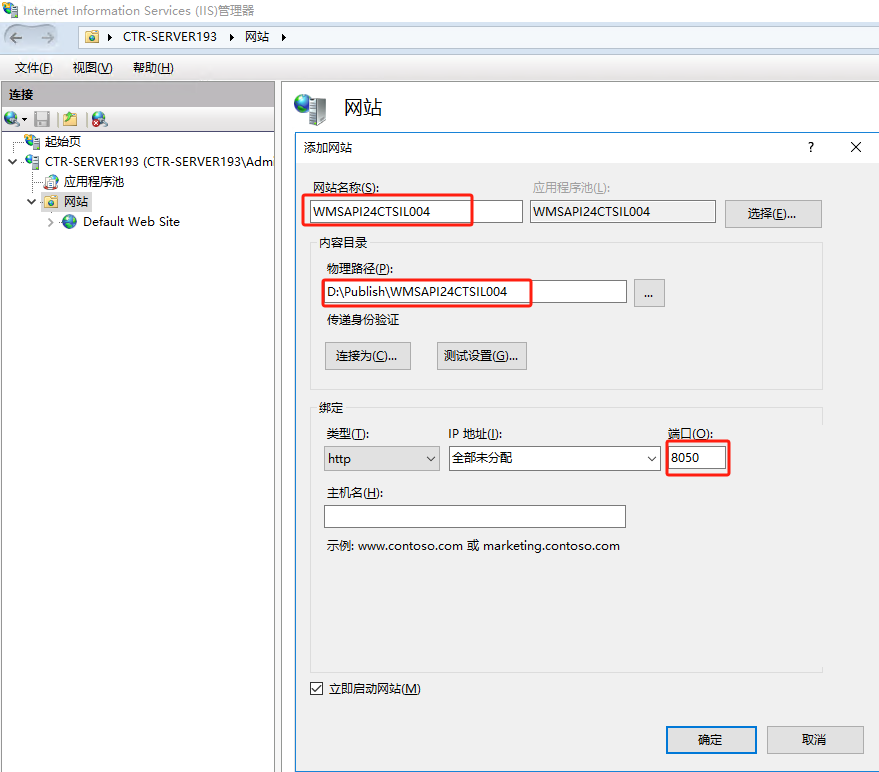 输入站点名:WMSAPI24CTSIL004、路径:D:\Publish\WMSAPI24CTSIL004、端口(8050)等必要信息