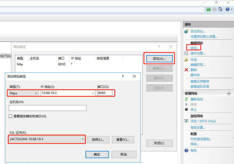 新增加https的绑定项目,选择类型为https,IP地址为10.88.19.3,端口为:8060