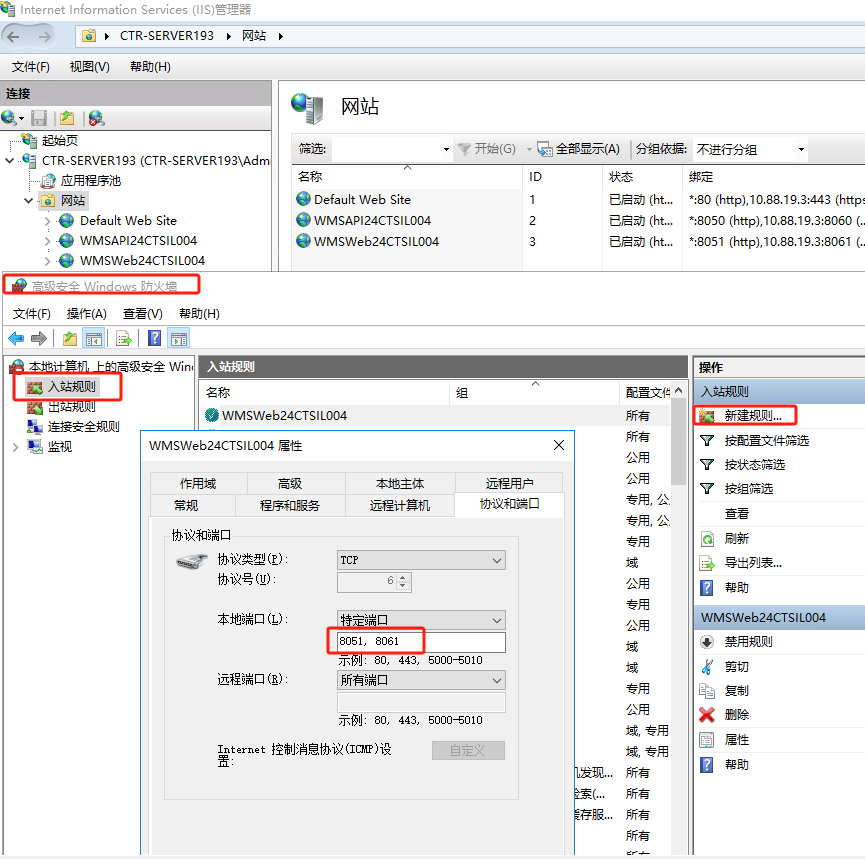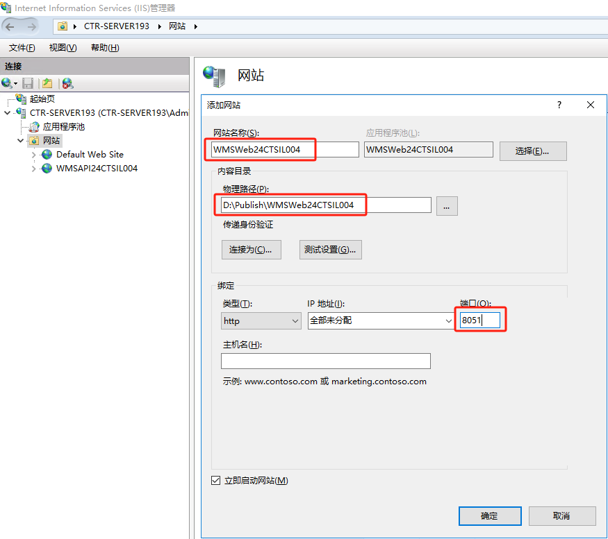 输入站点名:WMSWeb24CTSIL004、路径:D:\Publish\WMSWeb24CTSIL004、端口(8051)等必要信息
