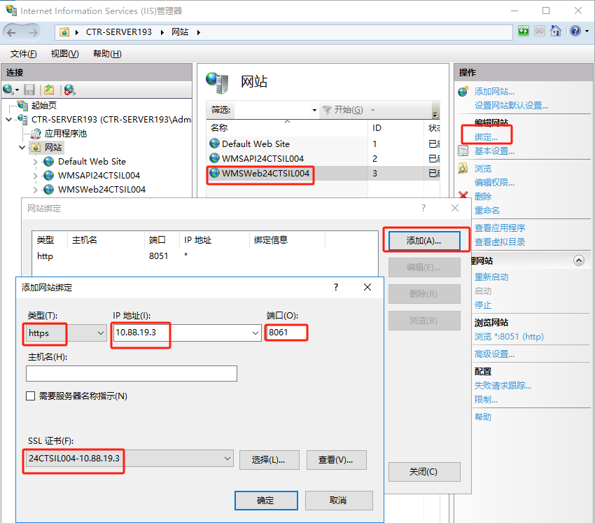 新增加https的绑定项目,选择类型为https,IP地址为服务器IP:10.88.19.3,端口为:8061