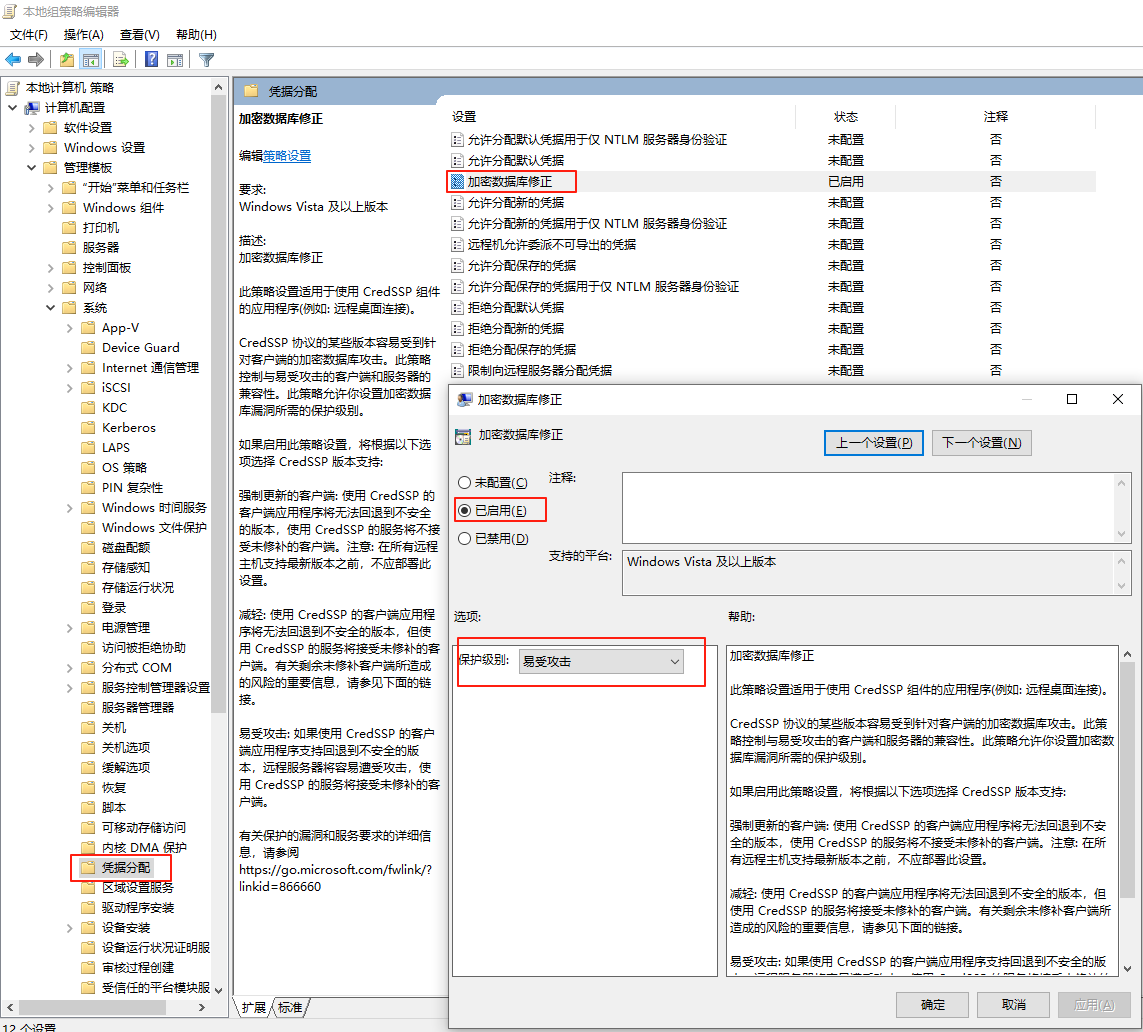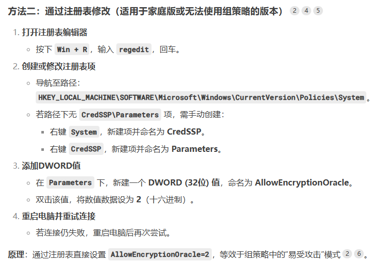 原理:此操作允许客户端回退到不安全的CredSSP协议版本,从而兼容未安装安全更新的远程服务器,但会降低安全性16。