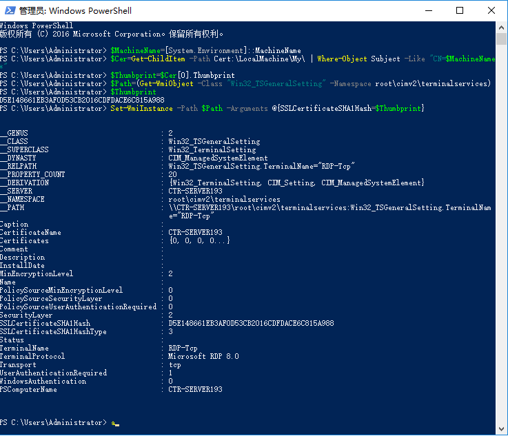 Set-WmiInstance -Path $Path -Arguments @{SSLCertificateSHA1Hash=$Thumbprint}