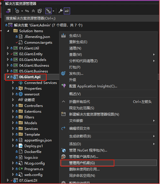 在06.Giant.Api项目上点右键,选择“管理用户机密”