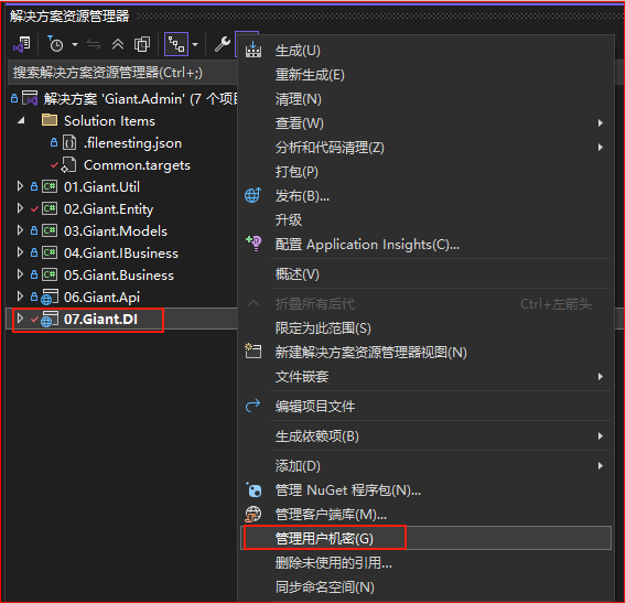 在07.Giant.DI项目上点右键,选择“管理用户机密”
