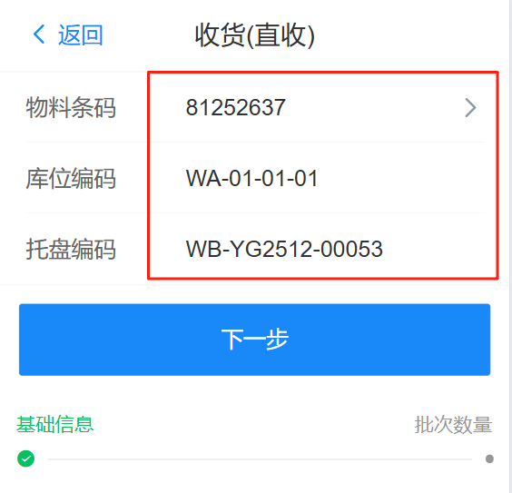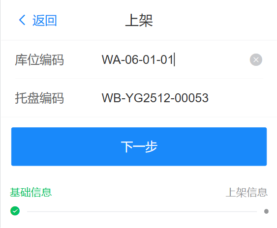 输入或扫描 物料条码、库位编码、托盘编码,点击下一步