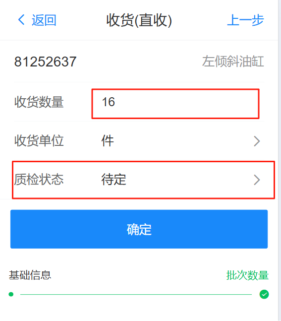 输入如下数量,质检状态(按批次策略所配置显示),点击确定完成收货
