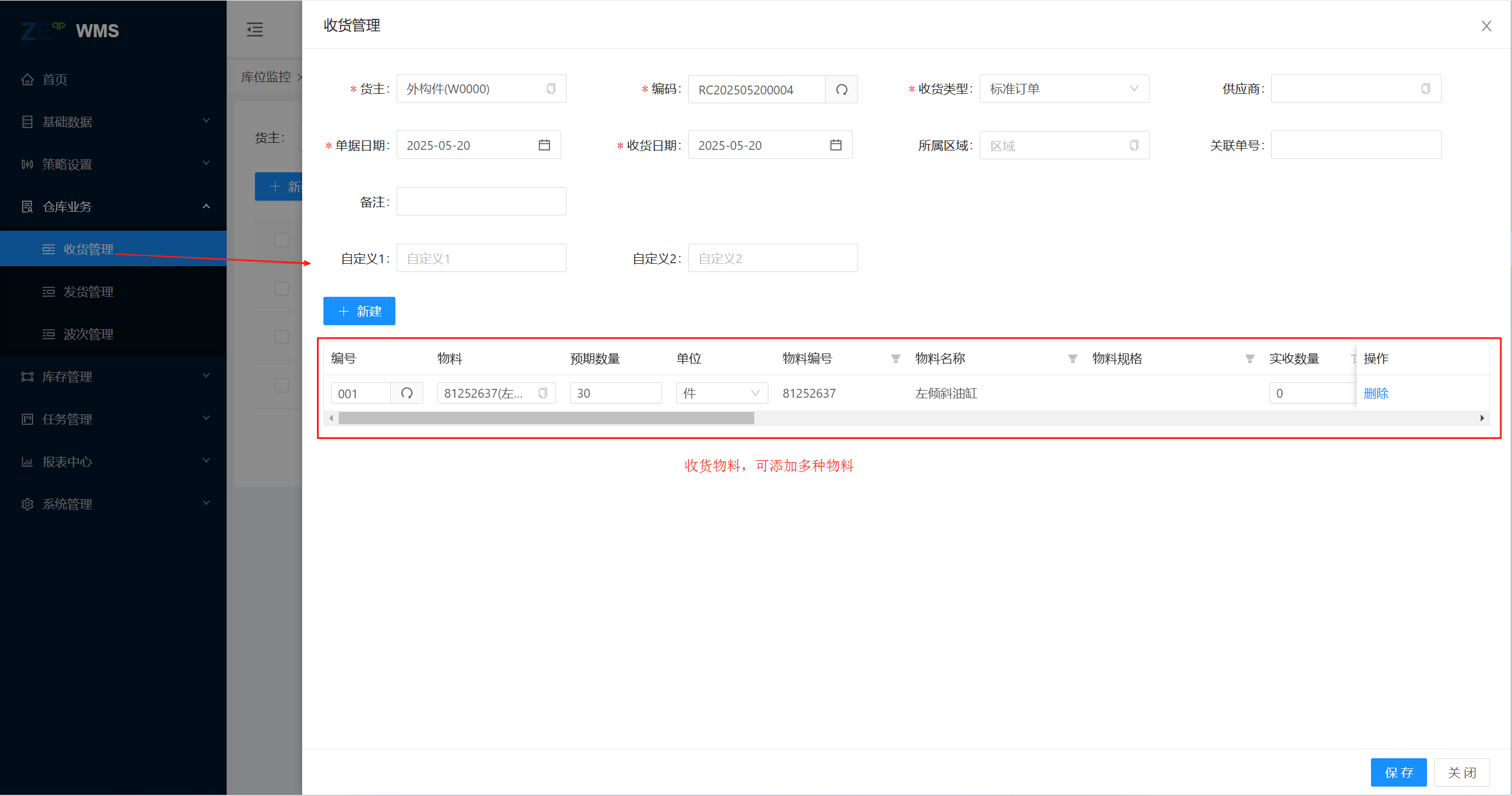 如下手动创建收货单:在wms系统的Web端,仓库业务》收货管理 中新增收货单数据,添加收货物料,预期数量,然后保存信息