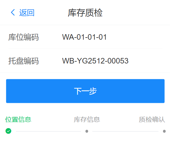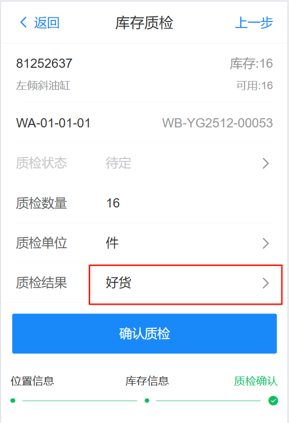 系统加载当前位置 物料的质检状态信息,点击信息,进入下一步