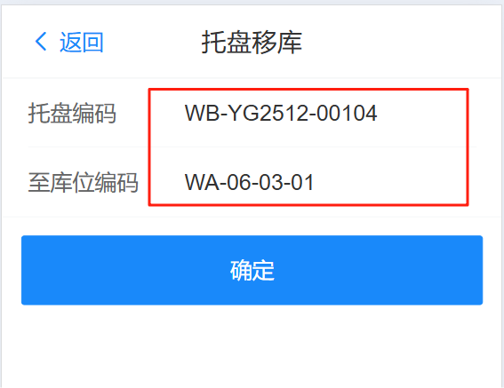 进入RF端页面,点击 功能 》托盘移库,扫描输入托盘编码,至库位编码,点击确认