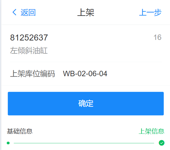 系统自动分配上架库位编码,点击确认生成上架任务,等待任务完成,完成入库
